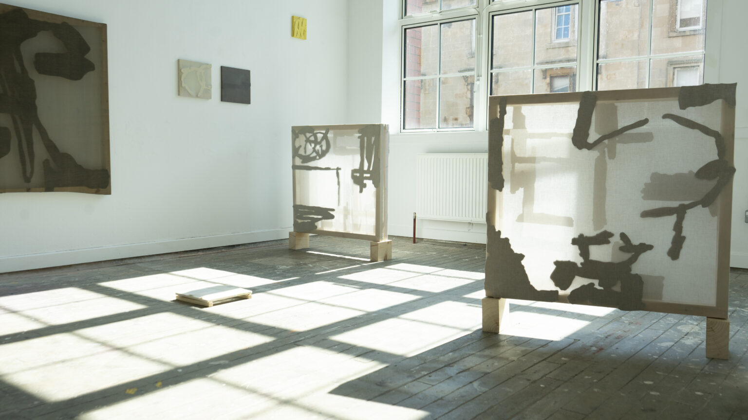 Hannah Gibson’s practice shifts between painting, drawing and textiles. Through layering these mediums, she explores ideas of materiality, archaeology and the built environment. Treating the surface as an active, responsive field, she approaches painting as an object in which form, structure and content are interdependent. Her use of fabric dyeing, frame construction and textile-based transparency reflects a sustained engagement with layering as a way of translating overlapping histories and temporal shifts. Drawing remains central to her process, functioning both as a spatial investigation and as a means of thinking through mark, matter and memory. In this way, her painting process mirrors the act of uncovering and excavating.