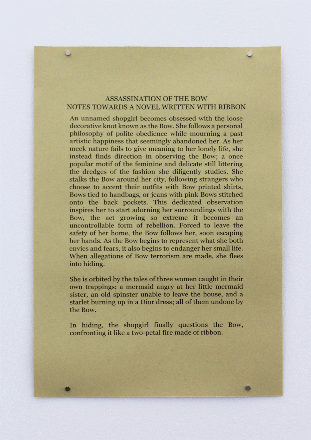 An unnamed shopgirl becomes obsessed with the loose decorative knot known as the Bow. She follows a personal philosophy of polite obedience while mourning a past artistic happiness that seemingly abandoned her. As her meek nature fails to give meaning to her lonely life, she instead finds direction in observing the Bow; a once popular motif of the feminine and delicate still littering the dredges of the fashion she diligently studies. She stalks the Bow around her city, following strangers who choose to accent their outfits with Bow printed shirts, Bows tied to handbags, or jeans with pink Bows stitched onto the back pockets. This dedicated observation inspires her to start adorning her surroundings with the Bow, the act growing so extreme it becomes an uncontrollable form of rebellion. Forced to leave the safety of her home, the Bow follows her, soon escaping her hands. As the Bow begins to represent what she both envies and fears, it also begins to endanger her small life. When allegations of Bow terrorism are made, she flees into hiding.