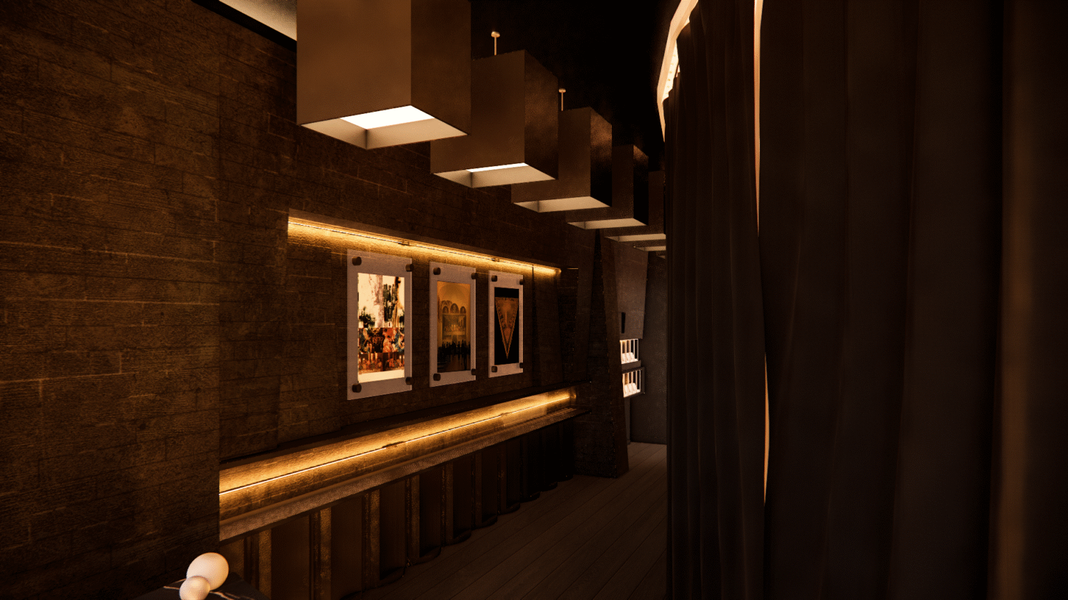 Based on this concept and keywords, a real banquet hall has been designed that can host entertainment activities such as dining, conversations, and dancing, while also providing a virtual spectacle experience. People can return to the entertainment of real life and enhance communication between people.